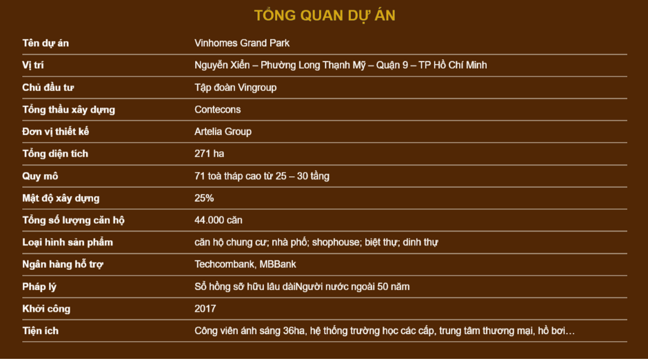 Với quy mô lên đến 271ha tại đường Nguyễn Xiển, phường Long Bình & Long Thạnh Mỹ, Vinhomes Grand Park không chỉ là một dự án bất động sản mà còn là một "thành phố thu nhỏ". Được phát triển bởi Tập đoàn Vingroup, dự án này sở hữu hệ sinh thái "all in one" độc đáo, mang đến cuộc sống tiện nghi, hiện đại: