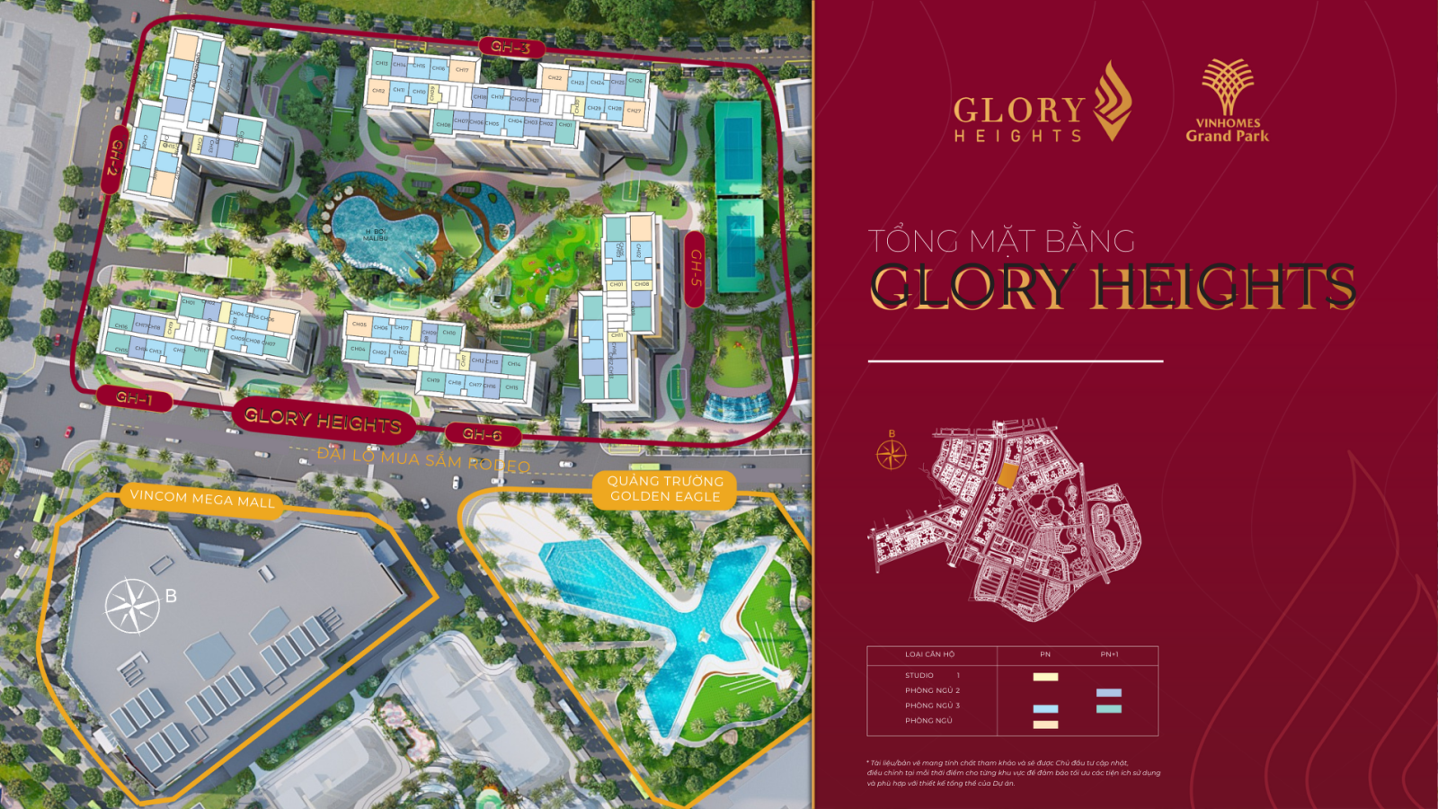 Glory Heights là phân khu căn hộ cao cấp đang được mong chờ nhất tại Vinhomes Grand Park. Tọa lạc tại vị trí "kim cương", đối diện trực tiếp Vincom Mega Mall – trung tâm thương mại "Life-Design Mall" lớn nhất miền Nam. Vị trí này không chỉ mang đến sự sầm uất, nhộn nhịp mà còn giúp cư dân dễ dàng tiếp cận với hàng loạt tiện ích mua sắm, ẩm thực và giải trí đẳng cấp.