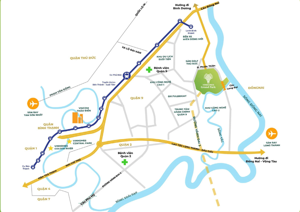 Với vị trí chiến lược, cư dân Vinhomes Grand Park dễ dàng di chuyển đến trung tâm thành phố và các khu vực lân cận qua nhiều tuyến đường quan trọng: